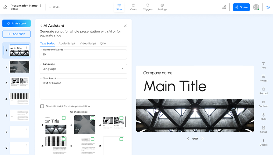 AI-powered solution for effective business presentations and content delivery Upload content, generate scripts, add voice-over or video avatar.